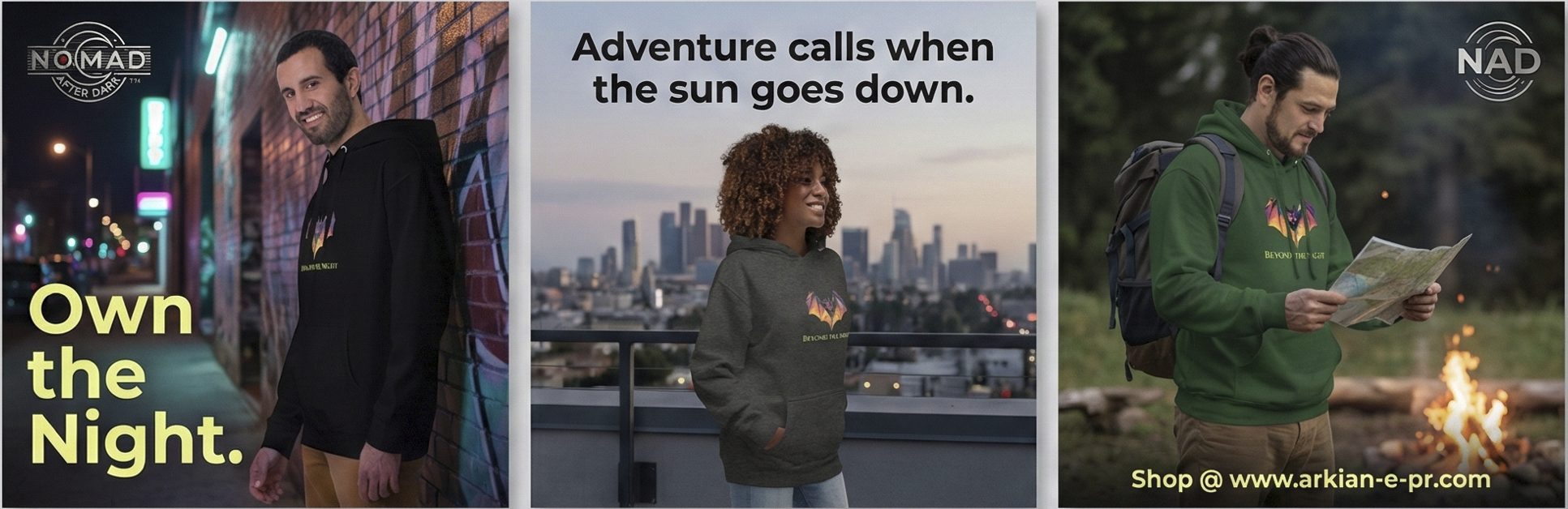 Nomad After Dark – "The Dancing Astronaut" Classic Tee $28.00 Nomad After Dark – Women's Longline Tee "Fear None, Conquer All" $25.00 Nomad After Dark – "Beyond the Night" Classic Comfort Tee $28.00 Nomad After Dark Backpack $55.00 Nomad After Dark – "The Dancing Astronaut" Premium Unisex Hoodie $60.00 Nomad After Dark - "Beyond The Night" Hoodie $45.00 Nomad After Dark – Women's Relaxed Fit Crop Top $30.00 Nomad After Dark – Men's Premium Tank Top "Fear None, Conquer All" $26.00 see all products